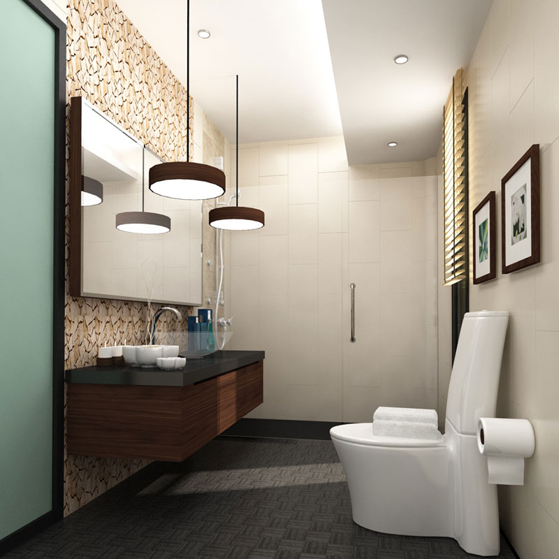Mẫu nhà vệ sinh sử dụng tông màu nâu gỗ ấm áp và thu hút người nhìn cùng những mobs đồ vệ sinh tông trắng.