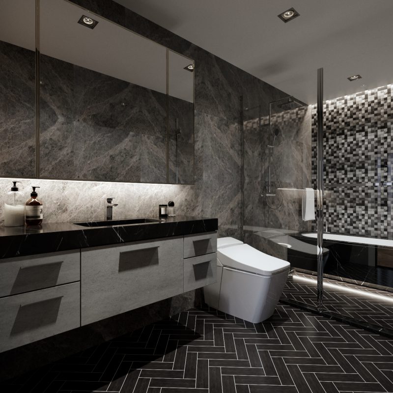 Mẫu nhà vệ sinh dùng tông màu trầm như đen, xám, nâu mang đến không gian trầm ấm và đầy thu hút.