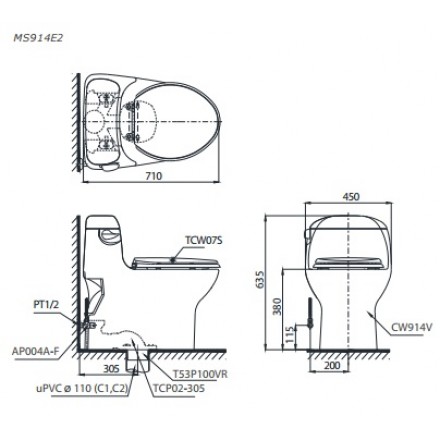 Bản Vẽ Kỹ Thuật Bồn Cầu TOTO MS914E2 (MS914RE2) Một Khối Nắp Cơ