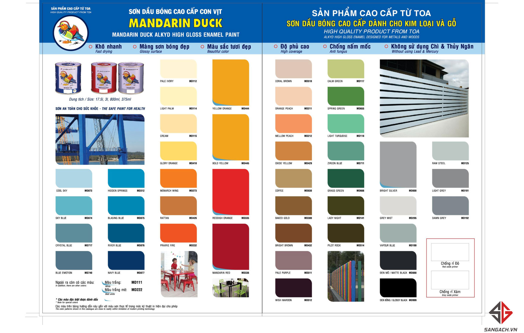 Sơn dầu bóng cao cấp Con Vịt là loại sơn Alkyd chất lượng cao, không sử dụng Chì & Thuỷ Ngân, là loại sơn an toàn cho sức khoẻ với các tính năng: Khô nhanh, màng sơn bóng đẹp, độ phủ cao, chống nấm mốc, màu sắc tươi đẹp. Sangach.vn xin chia sẻ bảng màu sơn xịt TOA - Con Vịt