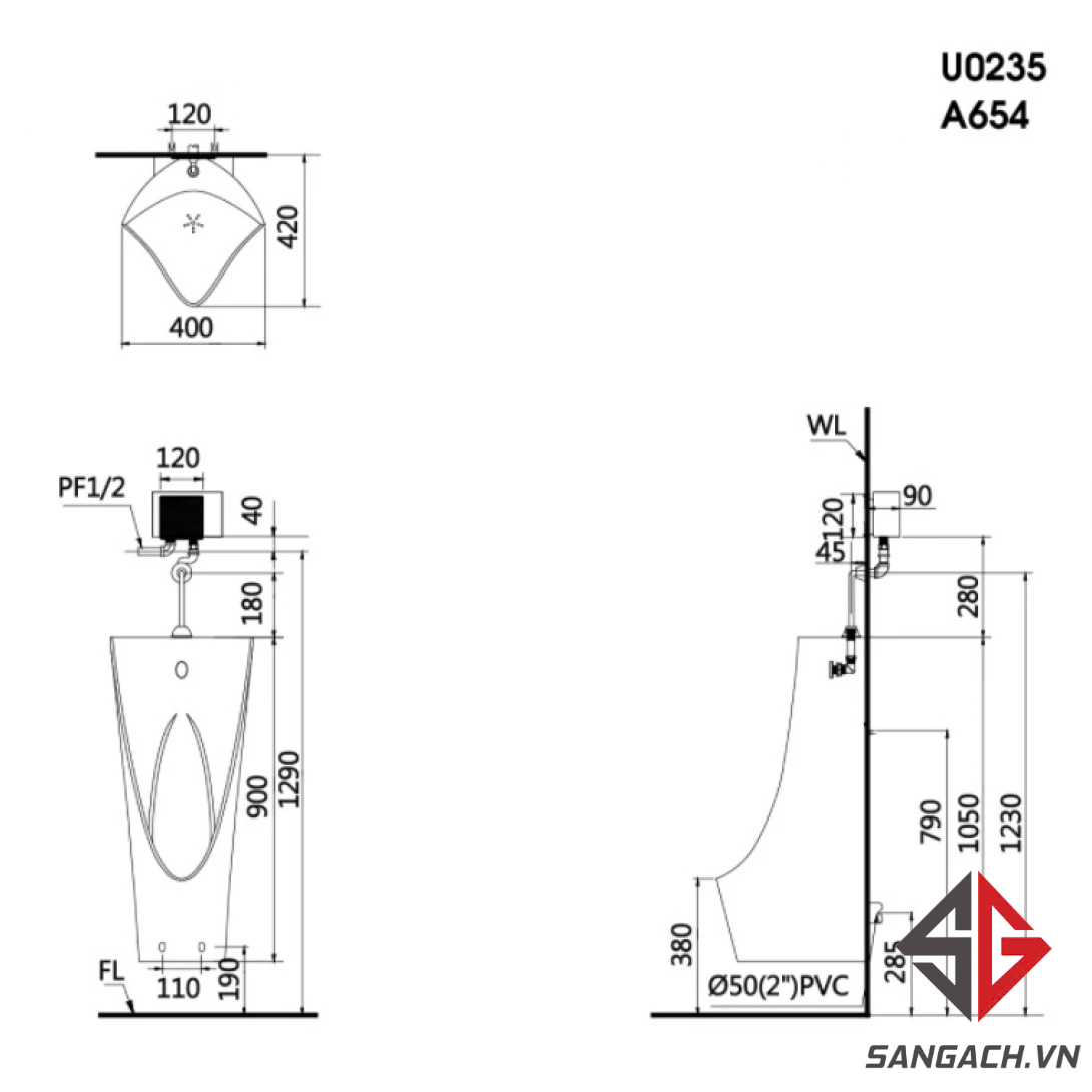 Bản vẽ kỹ thuật bồn tiểu treo tường U0235