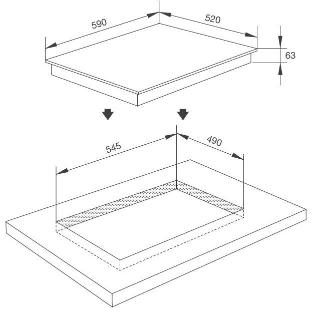 - Kích thước khoét đá : 545 x 490 mm (DxR)