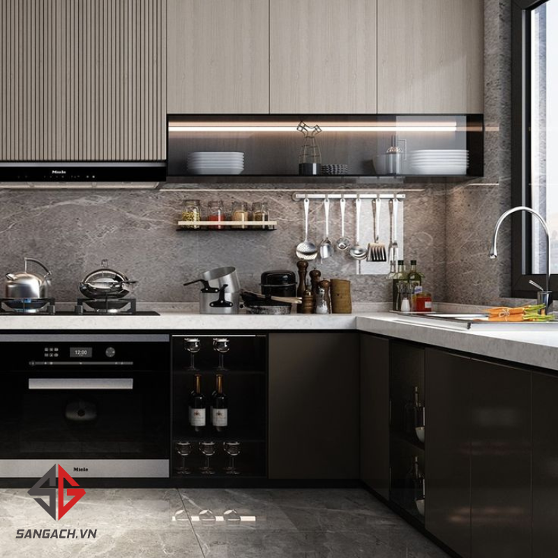 Gạch khổ lớn vân đá giúp căn bếp rộng hơn, cao hơn