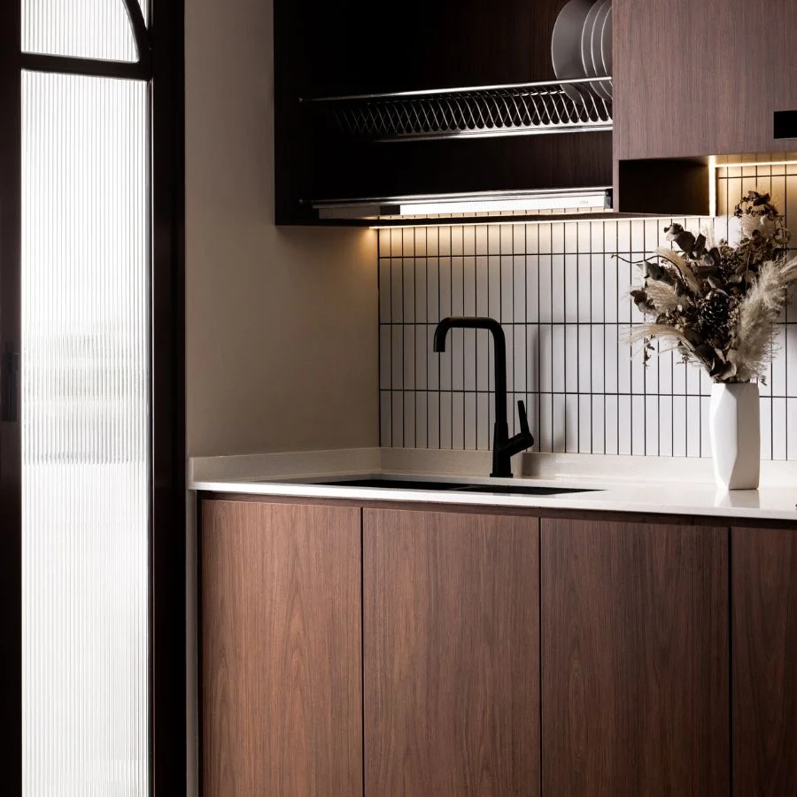 Màu gạch ốp bếp hài hoà với màu tủ bếp