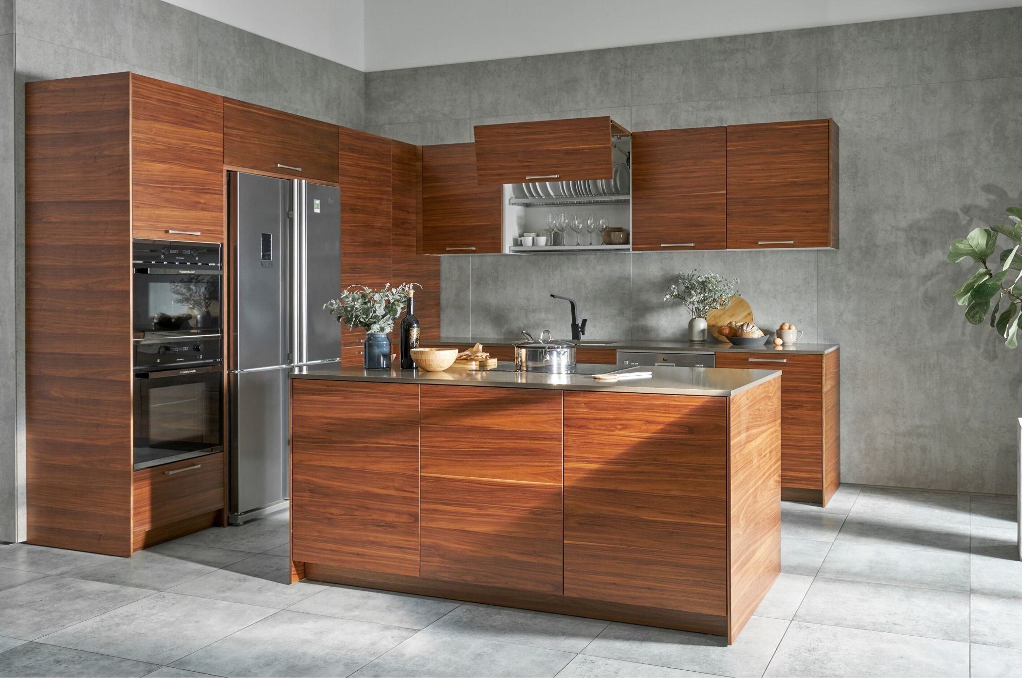 Gạch màu xi măng tương phản với tủ bếp màu gỗ