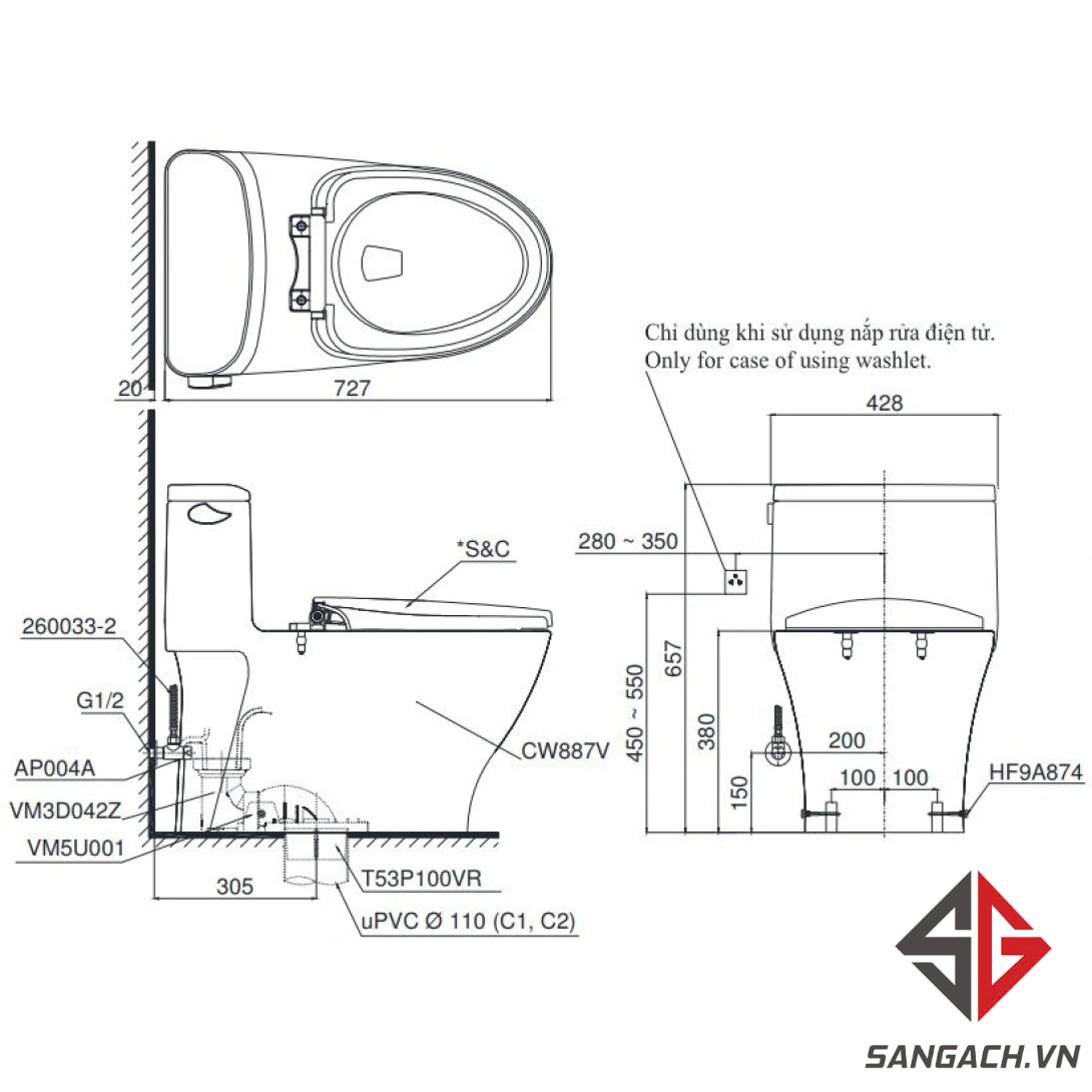 • Phù hợp lắp đặt với nắp rửa điện tử WASHLET (tùy chọn)