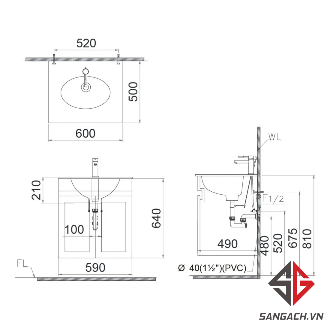 • Kích thước lavabo: 500 x 600 x 210 mm (dài x rộng x cao)