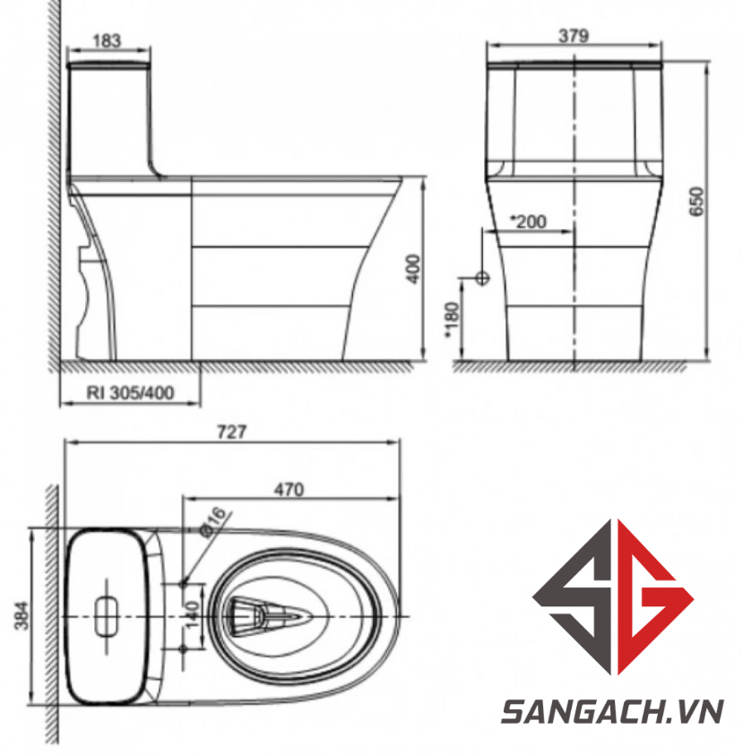 • Tâm xả: 305mm