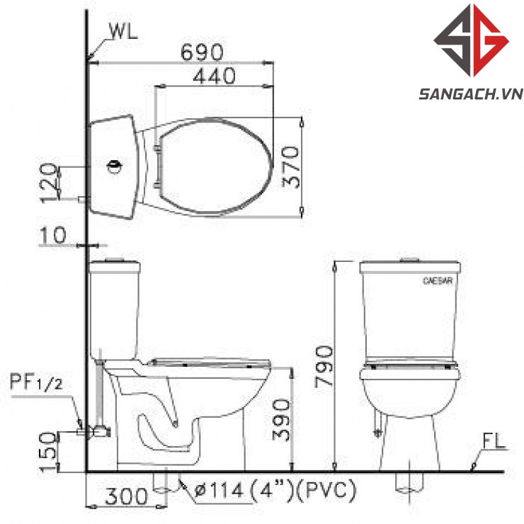 Bản Vẽ Kỹ Thuật Bồn Cầu CAESAR CD1325 Thùng T1225 2 Nhấn Nắp Thường: