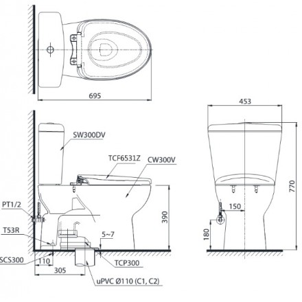 - Bao gồm: Thân cầu C300 (sx Việt Nam), két nước S300D (sx Việt Nam), nắp rửa điện tử TCF6531Z (sx Malaysia) và van khoá, gioăng đế