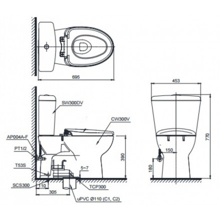 - Bao gồm: Thân cầu C300 (sx Việt Nam), két nước S300D (sx Việt Nam), nắp rửa điện tử TCF6631A (sx Malaysia) và van khoá, gioăng đế