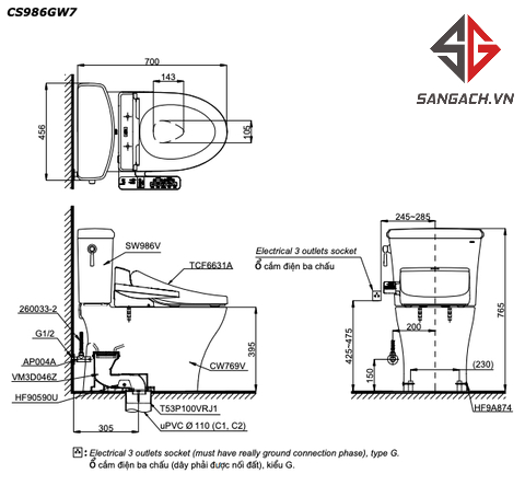 Thông tin bồn cầu TOTO CS986CGW17 nắp rửa điện tử: