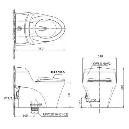 - Bao gồm: Thân cầu CW823NJ/V2 (sx Indonesia), nắp rửa điện tử TCF4731A (sx Malaysia) và van khoá, gioăng đế