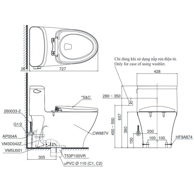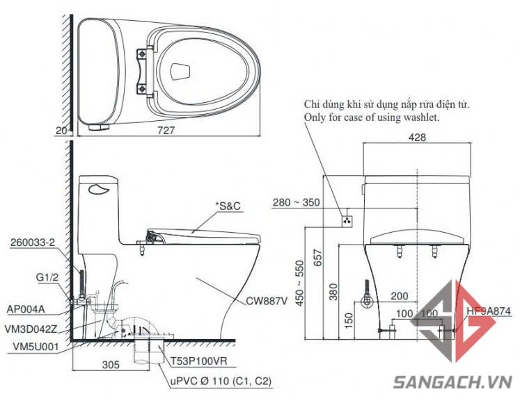 Bản Vẽ Kỹ Thuật Bồn Cầu Điện Tử TOTO MS887W6 Nắp Rửa Washlet