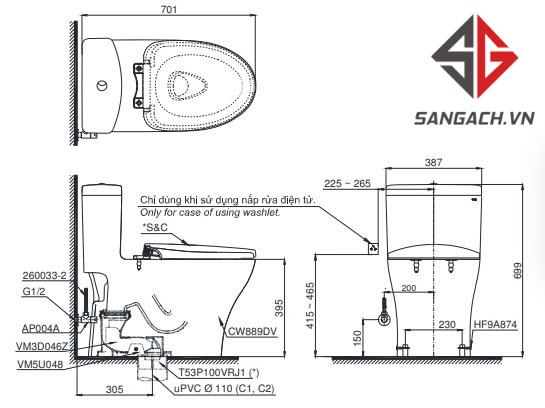 Bản Vẽ Kỹ Thuật Bồn Cầu Điện Tử TOTO MS889DRW6 Nắp Rửa Washlet