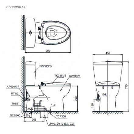 Bản Vẽ Kỹ Thuật Bàn Cầu TOTO CS300DRT3