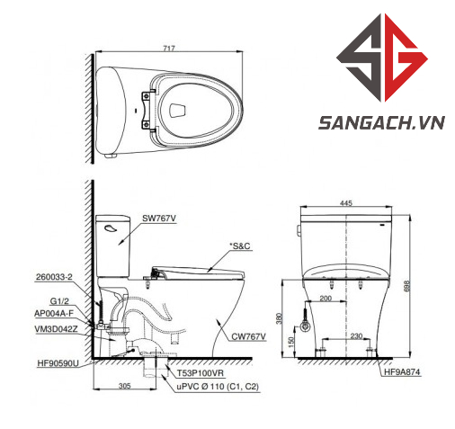 - Bao gồm: Thân cầu C767 (sx Việt Nam), két nước S767D (sx Việt Nam), nắp TCF6631A (sx Malaysia) và van khoá, gioăng đế