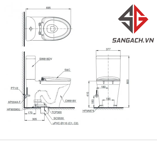 - Bao gồm: Thân cầu C818 (sx Việt Nam), két nước S818N (sx Việt Nam), nắp rửa điện tử TCF4911Z (sx Malaysia) và van khoá, gioăng đế