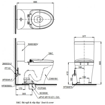 Bản vẽ kỹ thuật bàn cầu TOTO CS818DT3 nắp TC385VS