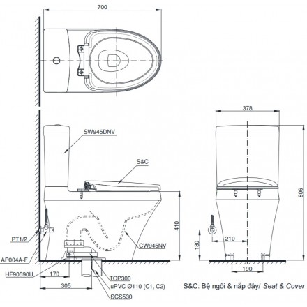 Bản vẽ kỹ thuật bàn cầu TOTO CS945DNT8 nắp TC600VS