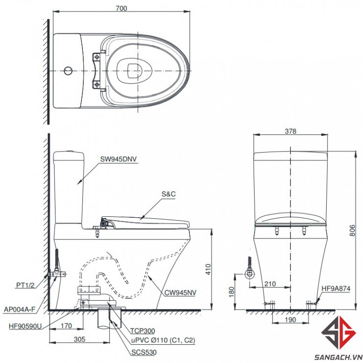 - Bao gồm: Thân cầu C945N (sx Việt Nam), két nước S945DN (sx Việt Nam), nắp tự động TCF4911Z (sx Malaysia) và van khoá, gioăng đế