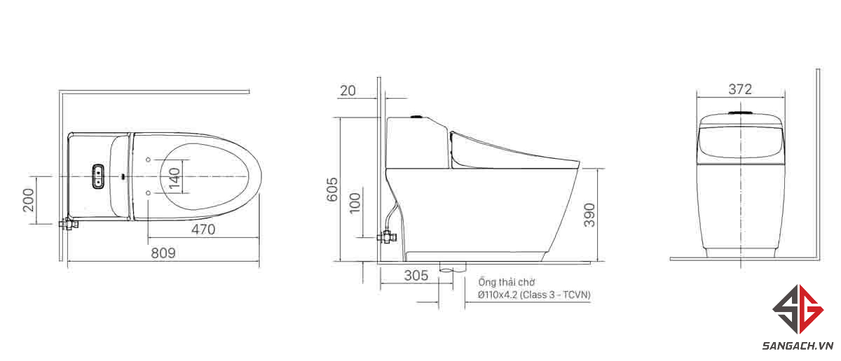 - Kích thước bồn cầu: 809 x 372 x 605mm (dài x rộng x cao)