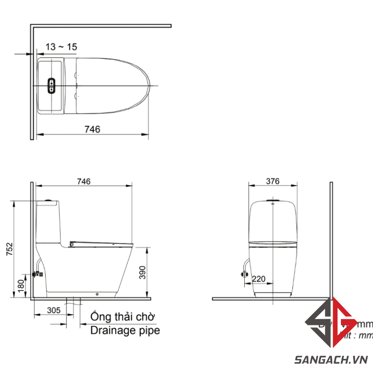 - Tâm thoát bồn cầu: 300mm (+-5)