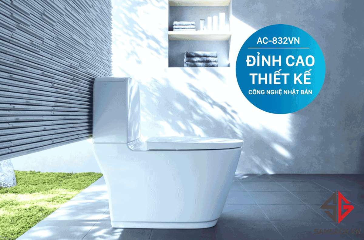 - Là bồn cầu 2 khối nhưng trông thiết kế của AC-832VN tương tự như bồn cầu 1 khối, phần thân cầu & két nước liền nhau tạo sự tinh tế hơn. Nếu bạn yêu thích thiết kế liền khối trang nhã của thân cầu 1 khối nhưng diện tích phòng tắm không quá thoải mái, đây sẽ là sự lựa chọn nhỏ gọn tuyệt vời.
