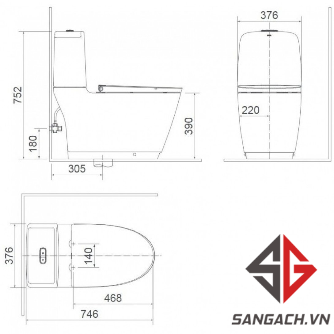 - Kích thước bồn cầu (DxRxC) : 746 x 376 x 752 mm