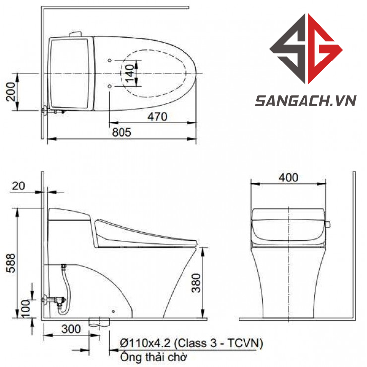 - Kích thước bồn cầu: 805 x 400 x 588 mm (dài x rộng x cao)