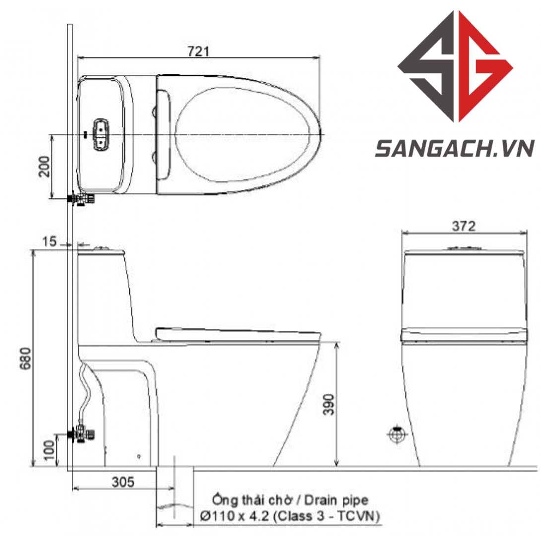 - Kích thước bồn cầu: 721 x 372 x 680 mm (DxRxC)