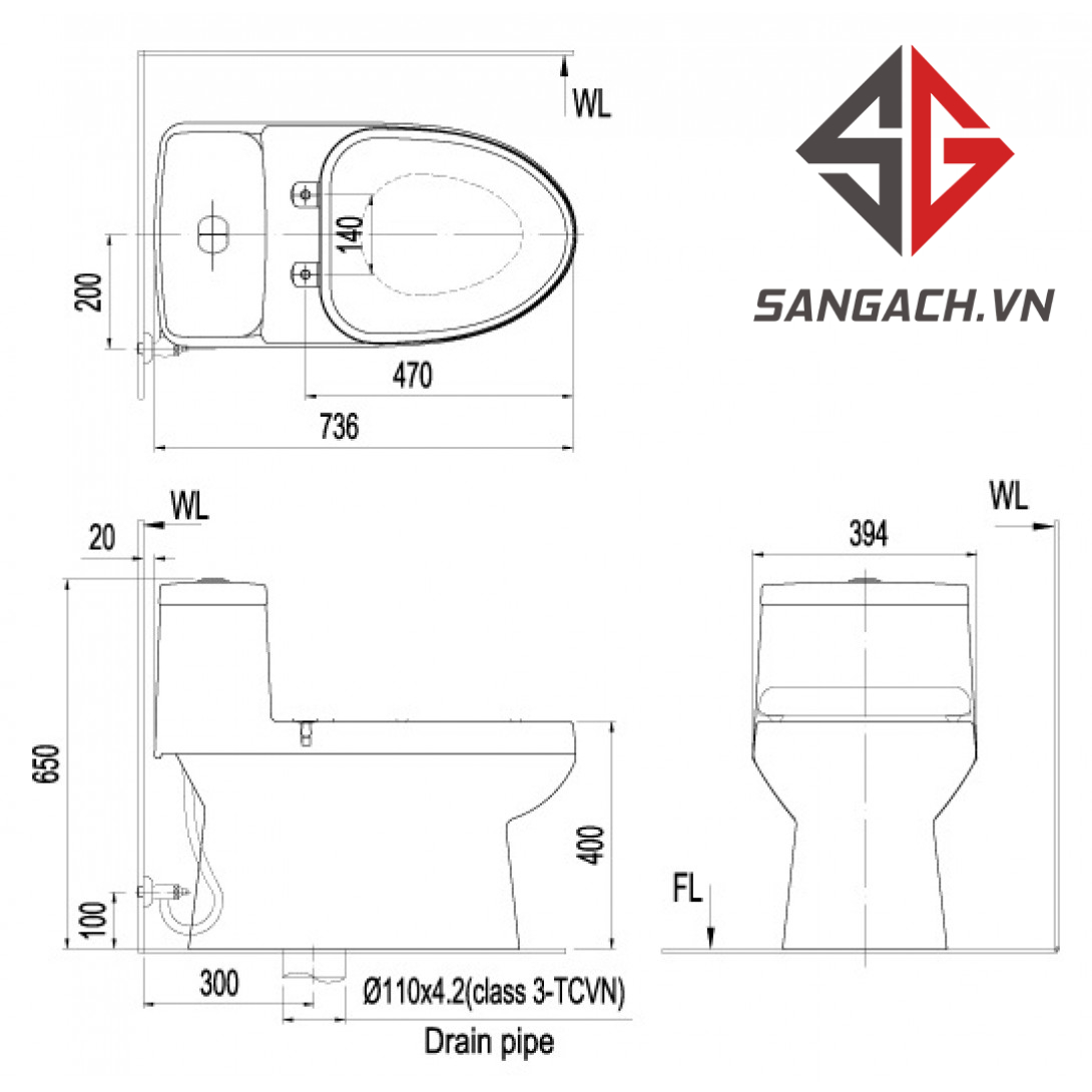 - Kích thước bồn cầu: 736x394x650 mm (DxRxC)