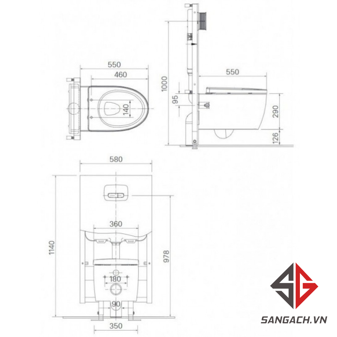 - Kích thước bồn cầu: 550x360x290 mm (DxRxC)