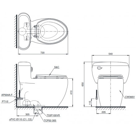 Bản vẽ bàn cầu một khối TOTO MS366T7