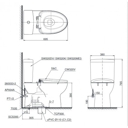 Bản Vẽ Kỹ Thuật Bàn Cầu TOTO CS320DRE4 Nắp Thông Minh