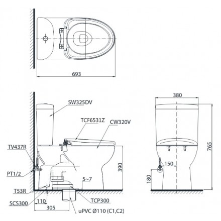 - Bao gồm: Thân cầu C320R (sx Việt Nam), két nước S325D (sx Việt Nam), nắp điện tử Washlet TCF6531Z (sx Malaysia) và van khoá, gioăng đế