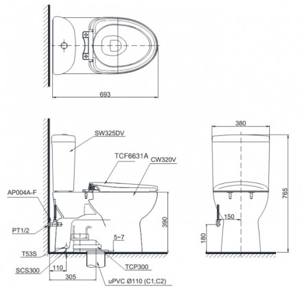 - Bao gồm: Thân cầu C320R (sx Việt Nam), két nước S325D (sx Việt Nam), nắp điện tử Washlet TCF6631A (sx Malaysia) và van khoá, gioăng đế
