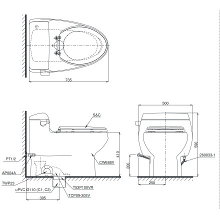 Bản vẽ bàn cầu một khối TOTO MS688E2