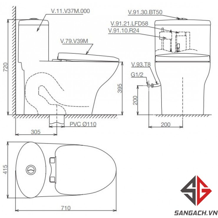 Bản Vẽ Kỹ Thuật Bồn Cầu Viglacera V37 Nắp V68 + Vòi Xịt VG826: