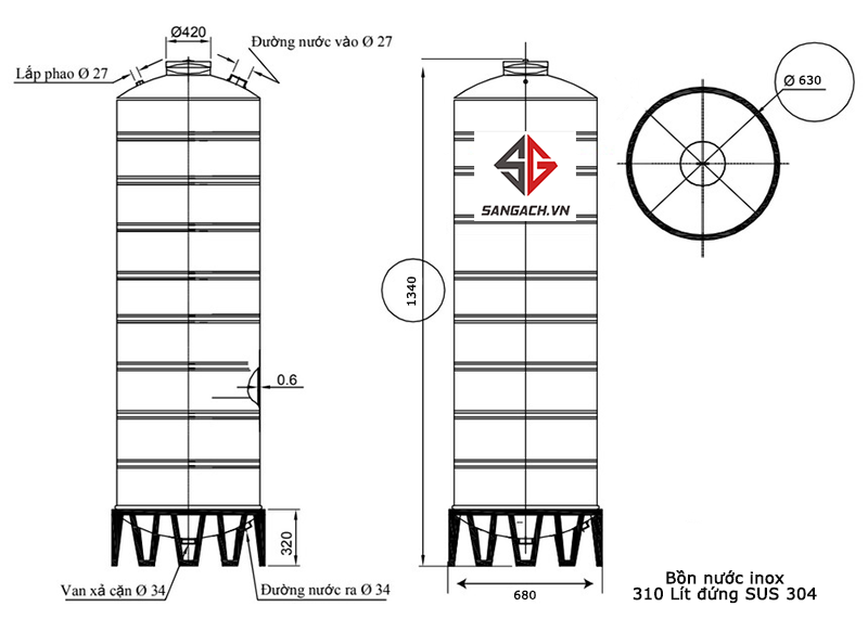 Bản vẽ 2D bồn nước inox Đại Thành 310 lít SUS 304