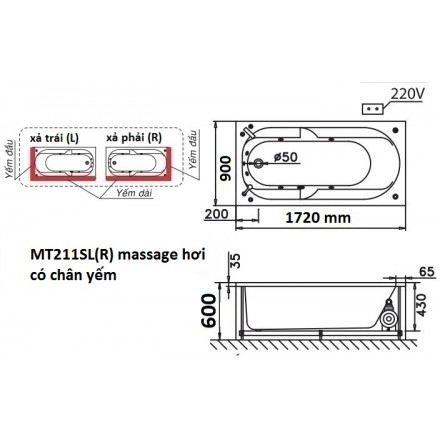 Bản vẽ kỹ thuật bồn tắm massage xây MT211SL/R 1,7 mét