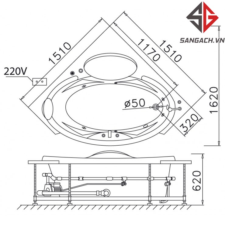 - Kích thước: 1510 x 1510 x 620 (dài x rộng x cao)