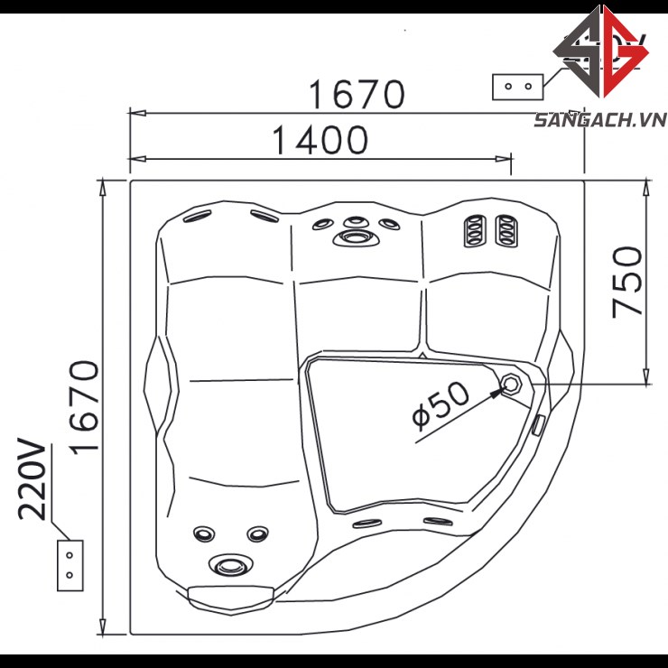 - Kích thước: 1670 x 1670 x 780 mm (D x R x C)