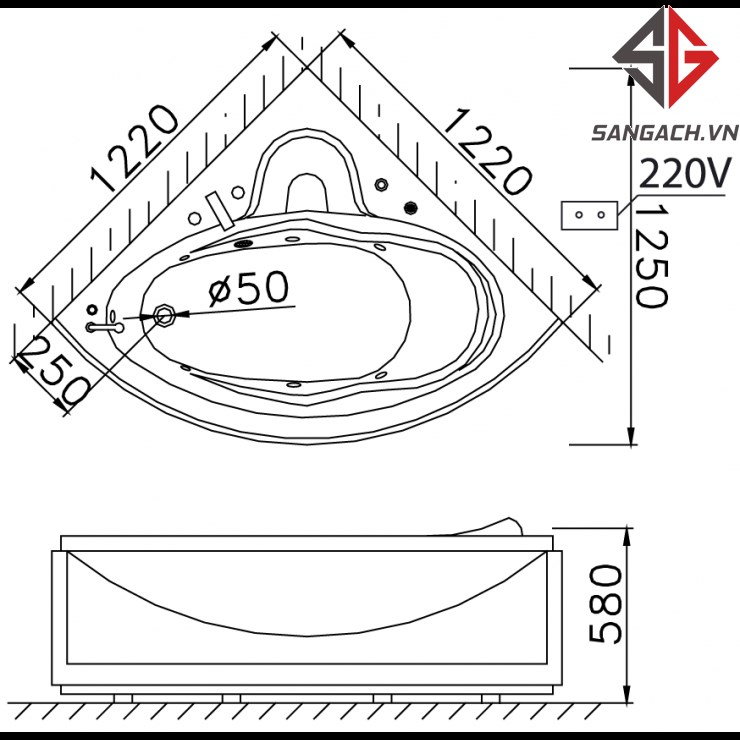 - Kích thước: 1210 x 1210 x 580 (dài x rộng x cao)