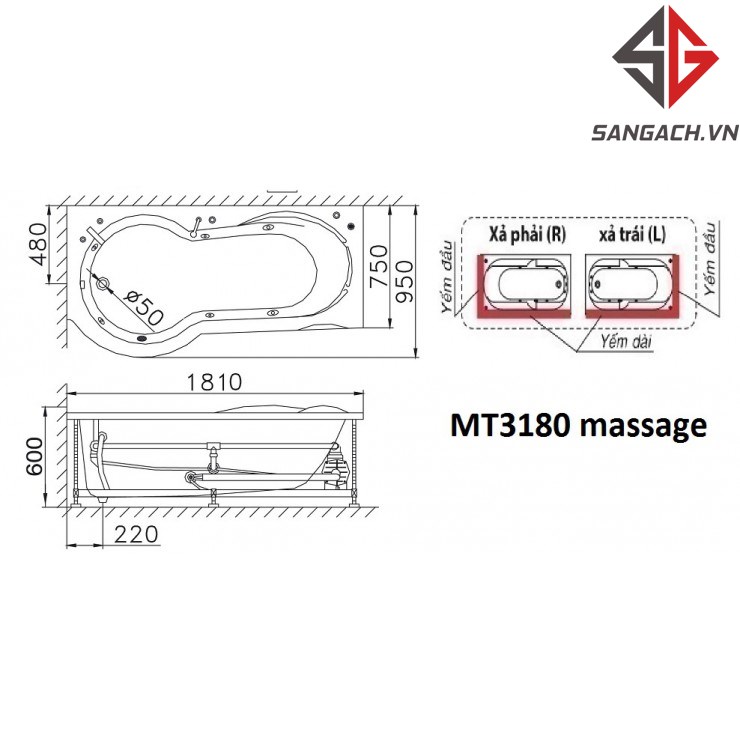 - MT3180R bồn tắm xả phải, yếm trái