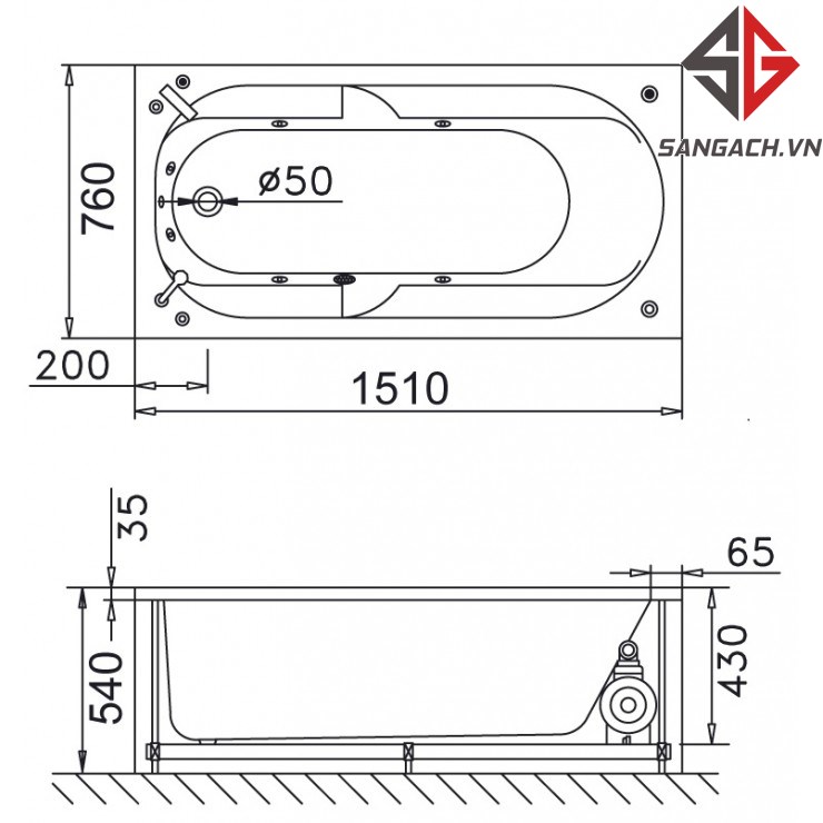 Bản vẽ kỹ thuật bồn tắm massage nằm Caesar MT0350 1,5 mét