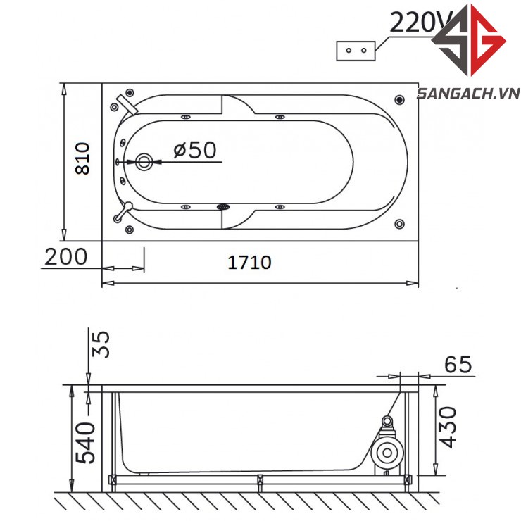 - Loại bồn tắm massage xây ( không có chân yếm)