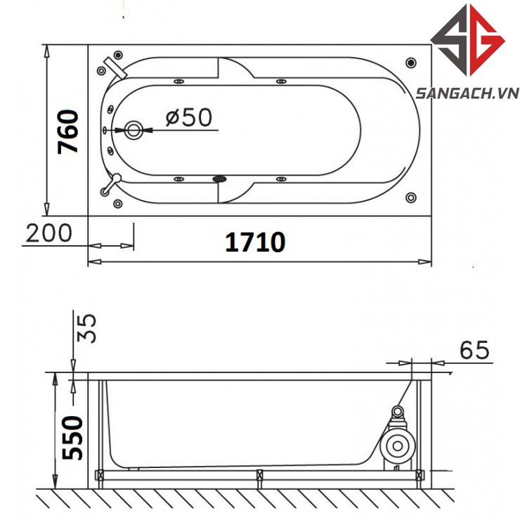 Bản vẽ kỹ thuật bồn tắm massage nằm Caesar MT0670 1,7 mét