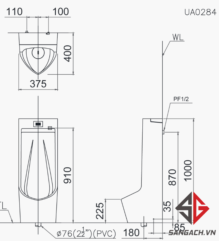 Bản vẽ kỹ thuật bồn tiểu treo tường caesar U0284: