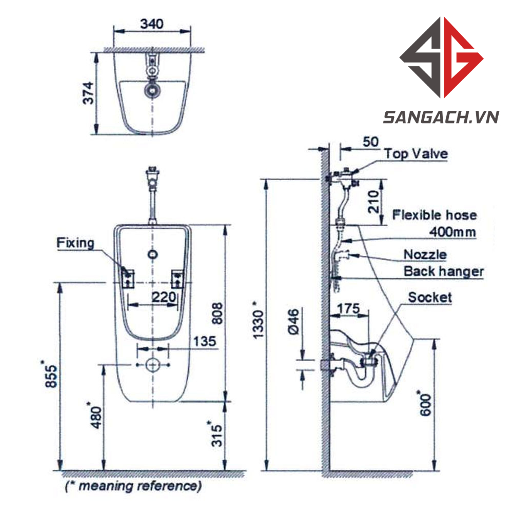 Bản vẽ kích thước bệ tiểu Inax AU-468V 0,5 lít cấp nổi